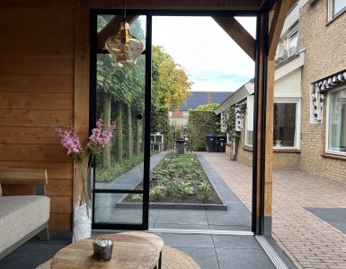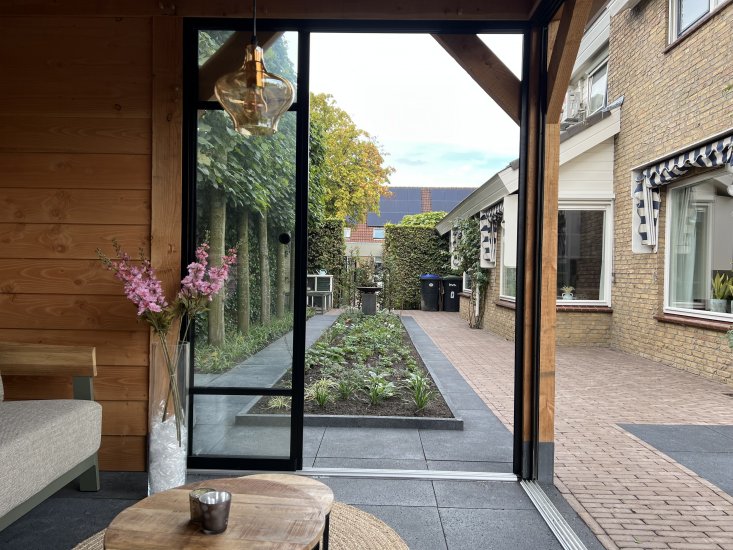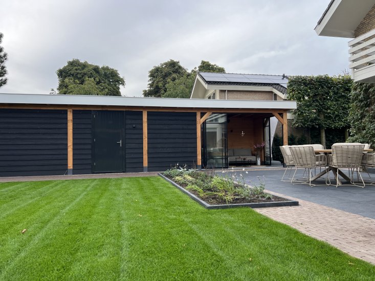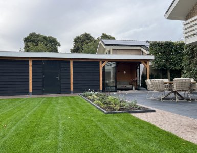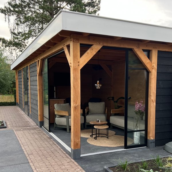 Centraal in het ontwerp staat een stijlvol buitenverblijf met overkapping en berging, volledig afgestemd op de wensen van het gezin. Dankzij de maatwerk glazen schuifwanden loopt binnen moeiteloos over in buiten. Het buitenverblijf is geïsoleerd en elektrisch te verwarmen, waardoor het een heerlijke plek is om het hele jaar door te ontspannen, te werken of gezellig samen te komen.