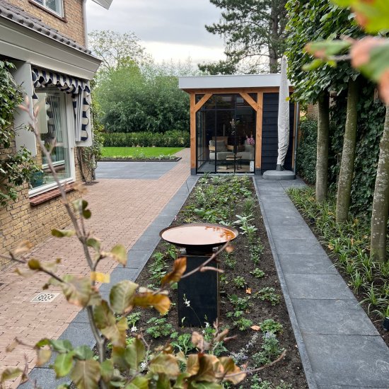 De tuin is aangelegd met vaste beplanting in verschillende bloeiperiodes, zodat er elk seizoen iets nieuws te ontdekken valt. Van frisse voorjaarsbloei tot rijke zomerkleuren en een sfeervol herfstbeeld: de tuin blijft het hele jaar door boeiend en in balans.