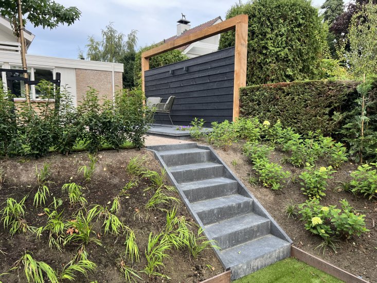 Het terras aan de zonzijde zorgt voor optimaal genieten van lange zomerdagen, terwijl verrassende details de tuin karakter geven. Zo vormt de waterschaal van cortenstaal een echte blikvanger en brengt deze rust, beweging en een warm accent in het tuinontwerp.