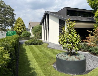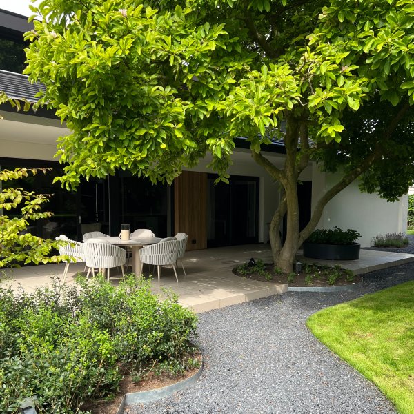 De vloeiende vormgeving, de zachte overgangen en de subtiele kleuren maken van deze tuin een plek waar alles klopt: een buitenruimte die rust brengt, meebeweegt met de seizoenen en aanvoelt als een natuurlijke verlenging van het huis.